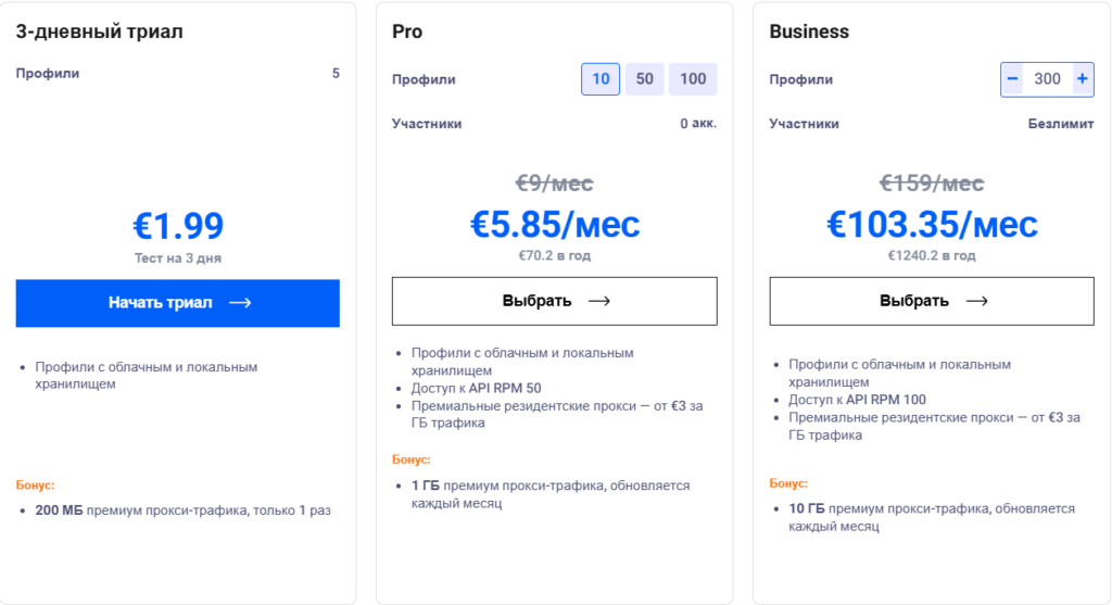 • Pro 10: от €5.85/мес (10 профилей, 1 GB трафика, годовая подписка).