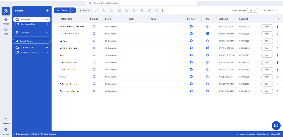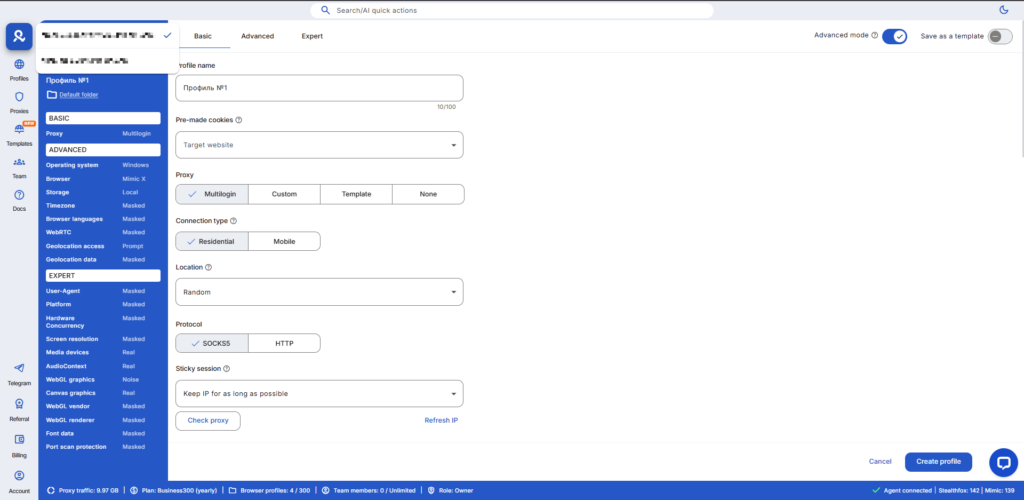 Настройка профилей доступна в трех режимах: Basic, Advanced и Expert, позволяя выбрать уровень детализации. Командная работа поддерживается ролями, панелью сессий и облачной синхронизацией куки, расширений и закладок. Двухфакторная аутентификация (2FA) защищает данные, а поддержка 24/7 на пяти языках (английский, русский, китайский, португальский, вьетнамский) оперативно решает вопросы.
